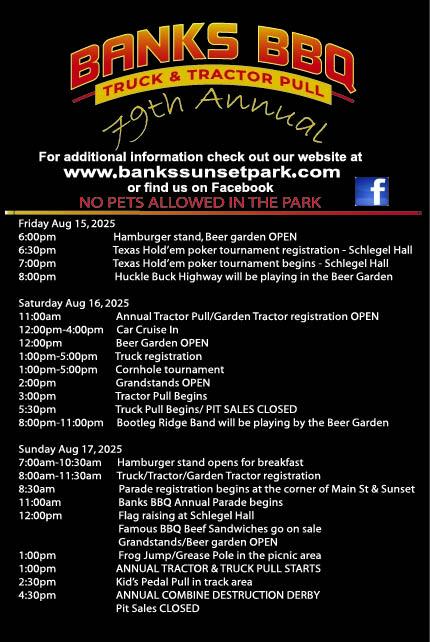 Banks Sunset Park is privately owned and run by volunteers working to better the community by supporting organizations such as he Boy Scouts, FFA, summer baseball, Youth soccer, and the local school district. It is completely funded by activities hosted at the park. We hope you enjoy your time here and thank you for your support.